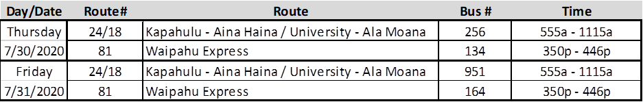 Upon notification, OTS began internal contact tracing and found no prolonged contact with any employees or customers. The mandatory face covering requirement to ride TheBus has greatly reduced operator and rider contact. The vehicles driven in or by the operator have been thoroughly disinfected and cleaned.