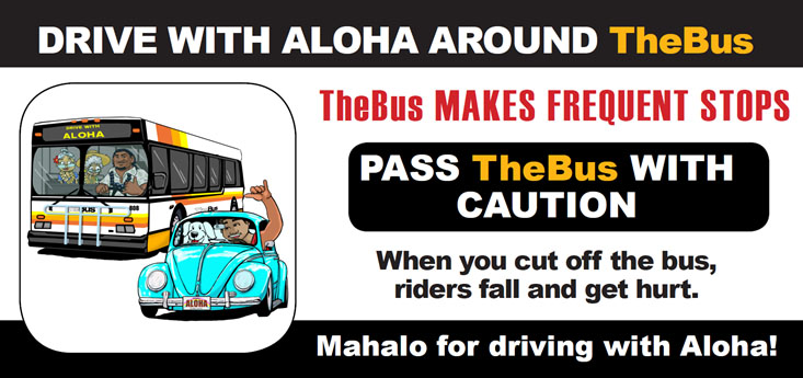 The campaign aims to reduce on-board injuries and incidents involving the most vulnerable riders, including the disabled and kūpuna. Motor vehicle drivers who suddenly cut in front of TheBus cause sudden braking by our operators, which leads to tripping, falling, and even serious on-board injuries.