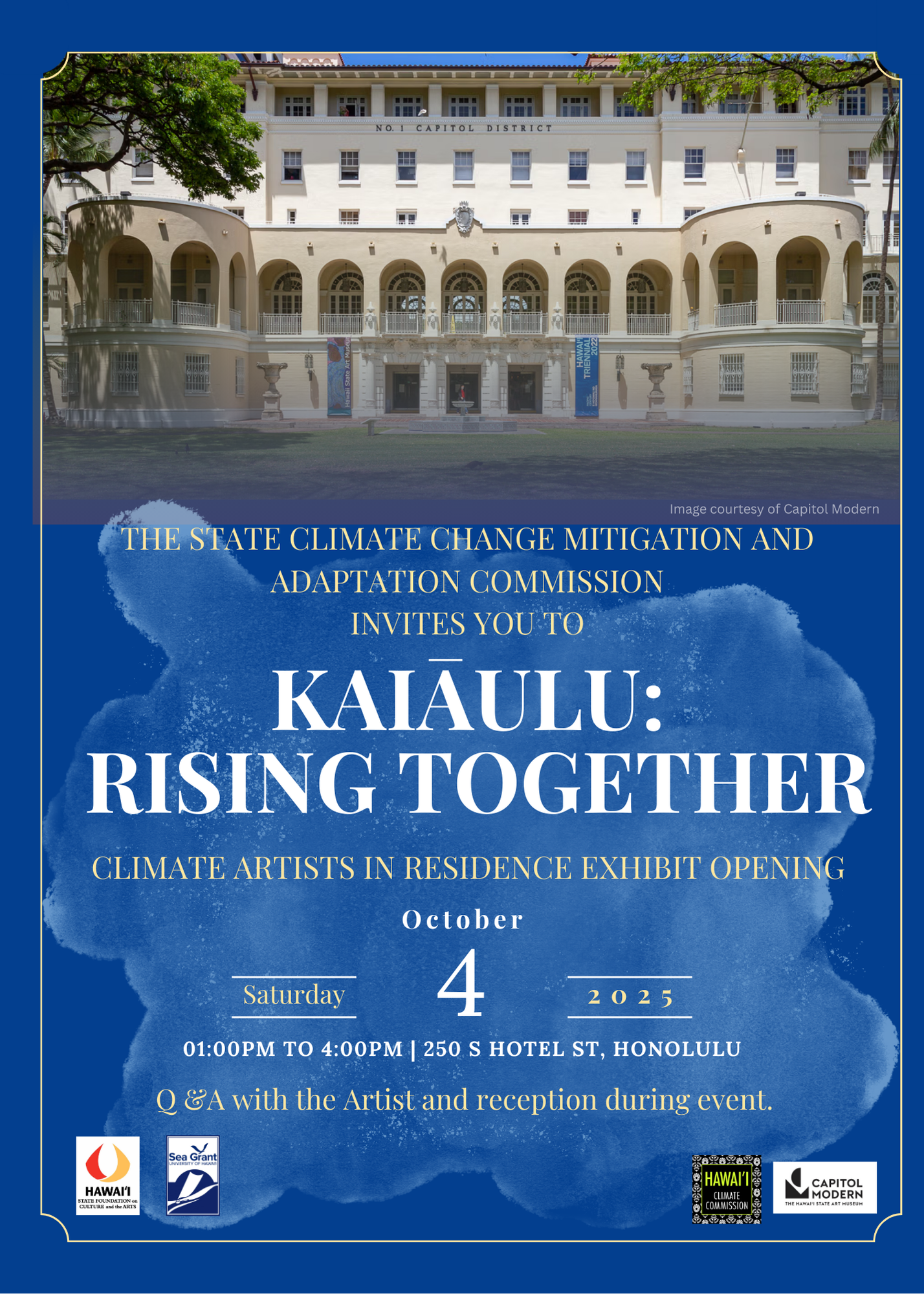 The State of Hawaiʻi Climate Change Mitigation and Adaptation Commission invites the public to the opening of “Kaiāulu: Rising Together”, Saturday October 4, 1:00 – 4:00 p.m. A question-and-answer session with the artists is scheduled during the event. The exhibit is a showcase of original artwork focusing on climate change issues and engaging the Climate Action Pathways in Hawai‘i by four talented local artists.