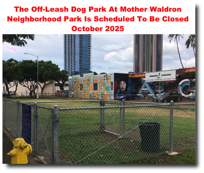 Calling all little ghouls and goblins! Put on your best costumes for a day of eerie-sistible family-friendly fun. Keiki and their families will follow creepy clues filled with freaky facts to track down members of the Zoo’s bird ‘ohana and collect creature stamps along the way. - The Off-Leash Dog Park At Mother Waldron Neighborhood Park Is Scheduled To Be Closed
