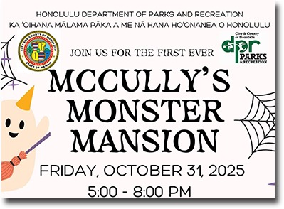 To mark this most spooktacular of holidays, our frighteningly delightful staff at McCully District Park are throwing their very first Monster Mansion event! It'll be on Halloween... Friday, October 31 from 5 p.m. to 8 p.m. at McCully District Park. - Kakaako - Honolulu, Hawaii Newsletter October 2025